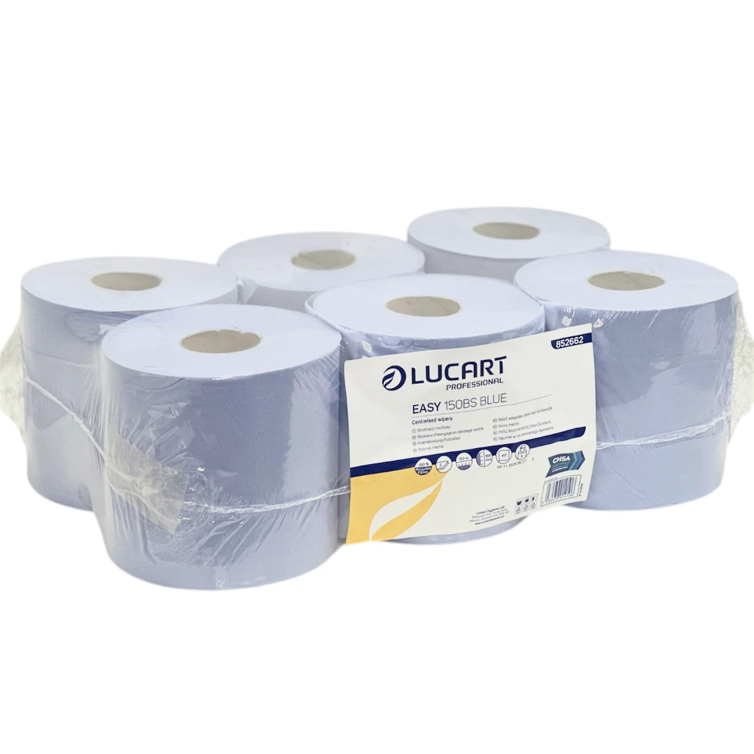 Lucart easy 150bs blue are 2-ply centerfeed paper wiper rolls. Made from 100% recycled fibres, featuring a 150m length and 16.6cm roll height. Designed for efficient, hygienic wiping, absorbing, and drying in industrial or food-safe environments. Sold in packs of 6. The blue colour is commonly used in food preparation environments for easy identification. Lucart easy 150bs is recommended for its strength, absorbency, and eco-friendly composition.